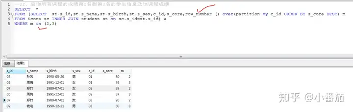 22、查询所有课程的成绩第2名到第3名的学生信息及该课程成绩(重要 25类似)