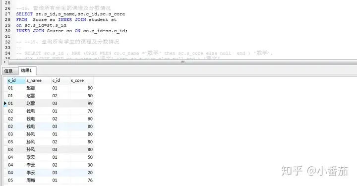 备注:1.因为要选出需要的字段 用case when 当co.c_name='数学' then 可以得到对应的 sc.s_core