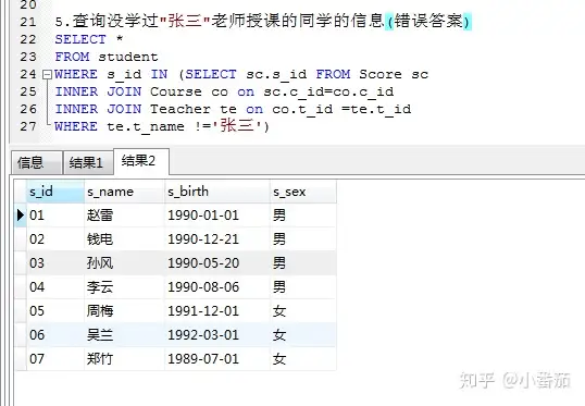 因为te.t_name !='张三' 查找出另外两个老师,对应的学生