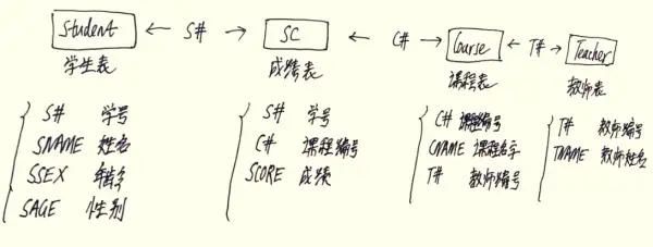 ps:这些题考察SQL的编写能力,对于这类型的题目,需要你先把4张表之间的关联关系搞清楚了,最好的办法是自己在草稿纸上画关联图,然后再编写对应的SQL语句就比较容易了。下图是我在草稿纸上画的这4张表的关系图,不好理解,你可以列举一些数据案例来辅助理解: