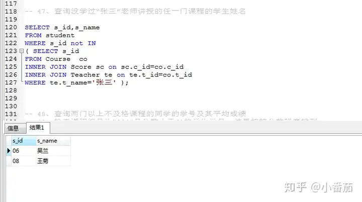 47、查询没学过“张三”老师讲授的任一门课程的学生姓名(还可以,自己写的,答案中没有)