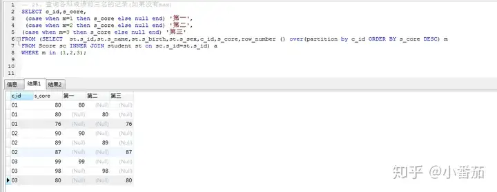 备注:如果想选出学生信息,那成绩,就是以列的形式出现,如果1.2.3名以行的形式出现,就不能有对应的学生信息。(见25题