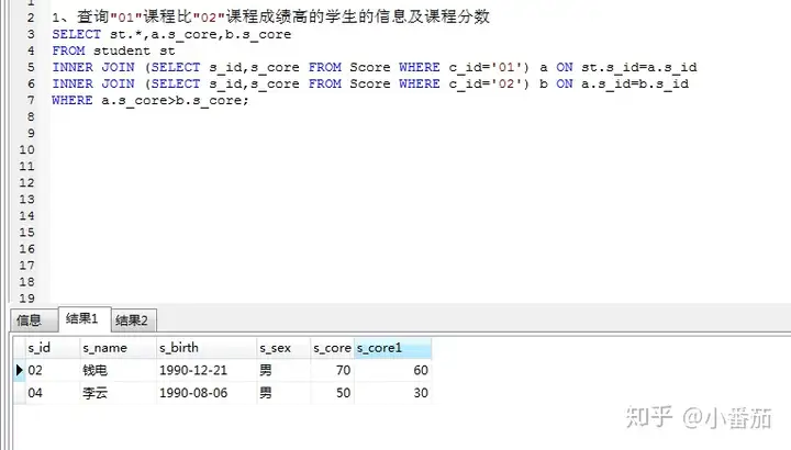 1.查询课程编号为“01”的课程比“02”的课程成绩高的所有学生的学号(重点)