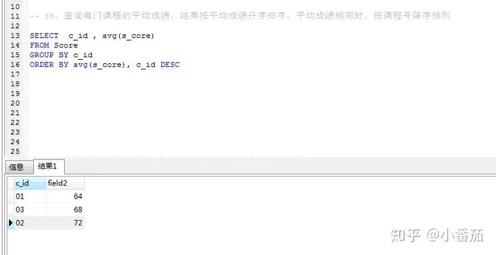 33、查询每门课程的平均成绩,结果按平均成绩升序排序,平均成绩相同时,按课程号降序排列(不重要)