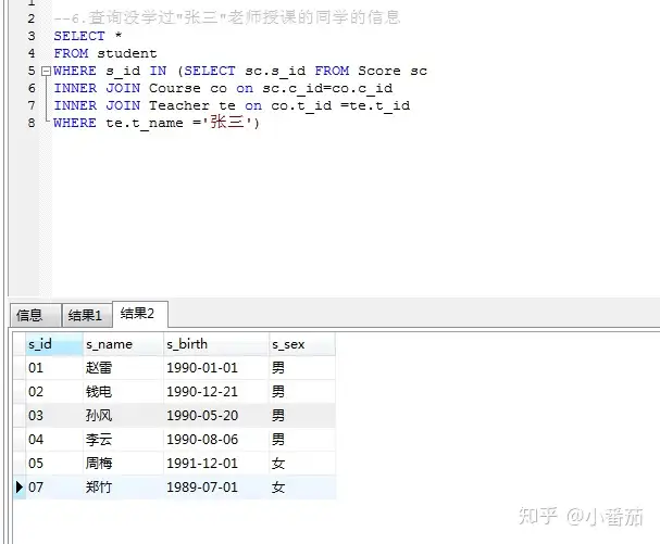 6、查询学过“张三”老师所教的所有课的同学的学号、姓名(重点)
