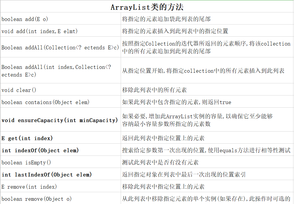 // 默认构造函数 ArrayList() // capacity是ArrayList的默认容量大小。当由于增加数据导致容量不足时,容量会添加上一次容量大小的一半。 ArrayList(int capacity) // 创建一个包含collection的ArrayList ArrayList(Collection<? extends E> collection)
