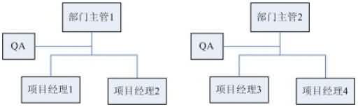在职能型组织结构中,各个职能部门可能会设立自己的QA岗位。QA独立于项目组,直接向部门主管报告,但在业务上也向项目经理进行汇报。如图1所示。在职