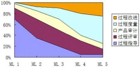 CMMI不同成熟度等级对QA职责的要求有较大的不同,过程成熟度是影响QA工作分布很重要的因素。成熟度等级较低时,由于过程体系尚处于建立过程中,员 工的过程意识不强,所以QA的工作主要集中在收集最佳实践、定义过程体系和培养员工建立过程意识方面。随着过程体系的实施、完善和制度化,QA的工作重点 转移到过程评审和产品审计。当企业达到了高成熟度等级,即4、5级时,过程的执行已经高度制度化,成为员工的工作习惯,因此过程评审和产品审计所需要的工 作量也大量减少,而定量管理需要QA作为专业人员更多地投入度量分析工作中。组织级的过程变革、技术变革等过程改进工作是5级企业对QA最主要的要求。如 下图所示,随着成熟度等级的变化,QA花费在过程指导、过程评审、产品审计、过程度量和过程改进方面的工作量分布也不同。