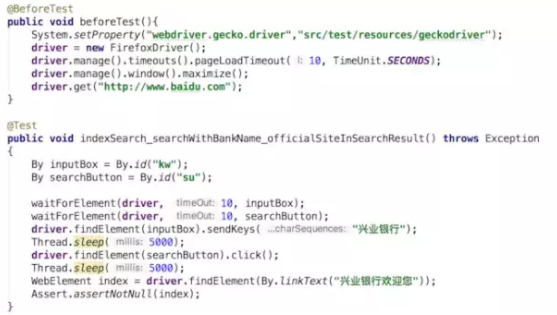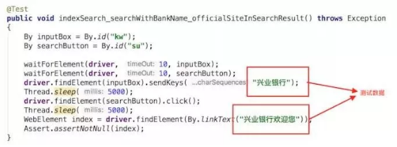 它要测试的东西其实是要看一下百度搜索能不能返回兴业银行的官网。我们分析一下这段代码都包含些什么东西。