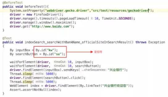 第一,这段代码包含了定位符。熟悉Selenium的都知道,inpubBox和searchButton就是网页的元素,通过By.id实例化,然后driver在findElement 的时候是通过他们的id,就是”kw”和”su”找到他们的。所以”kw” 和”su”就是他们的定位符。
