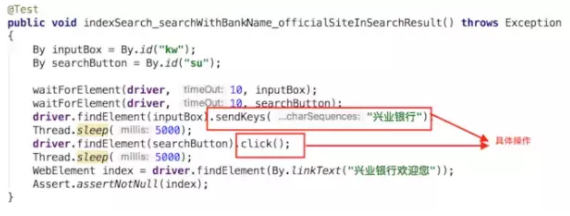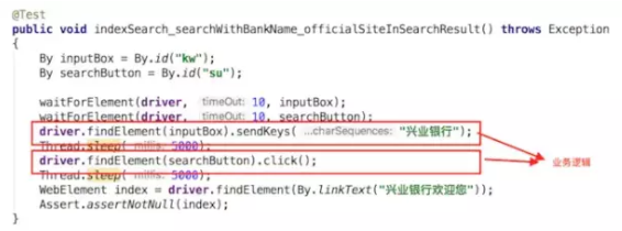 第三部分没前面两部分那么直观。这段代码在基于”kw”找到inputBox后,往里填入“兴业银行”四个字,然后点击了searchButton提交搜索申请,然后在搜索结果里面寻找“兴业银行欢迎您”的text,然后以是否找到这个text作为assert的标准。这些测试步骤反映的是真实的业务逻辑, 并且不能随意更换顺序。所以第三部分是业务逻辑。