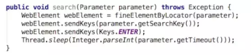 PageAction用于定义每个关键字对应的具体操作。我们以search方法为例,通过传入Parameter来获取search需要的元素定位于要输入的搜索文本,然后执行真正的搜索操作,并等待特定的时间。