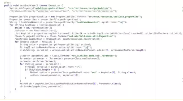 TestBankIndex是主测试类,但实际上里面就一个testEachCase方法。里面大量使用Java 反射机制来实例化和执行方法。所以,testEachCase在执行的时候,它不到最后一刻都不知道它要运行哪个测试用例与执行什么操作的,这些完全在testCase.properties里面定义。