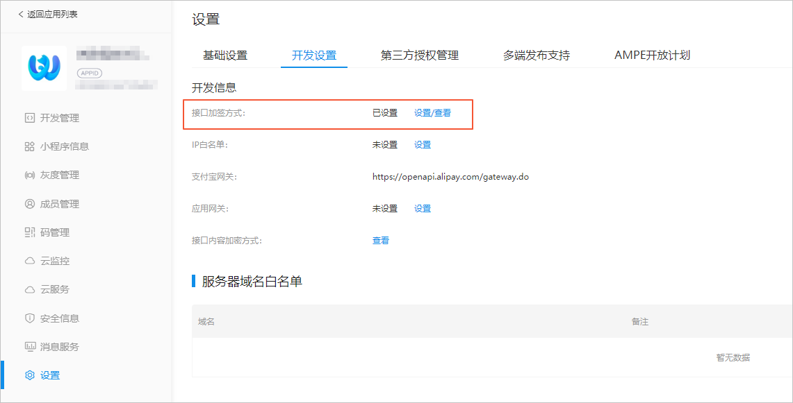 4.单击【开发设置】,然后单击【设置】,设置接口加签方式。