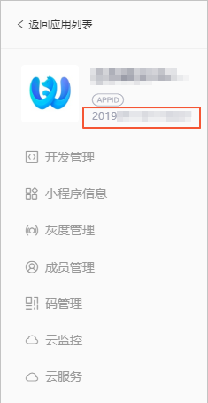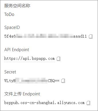 appId: '2021*********', // 小程序应用标识 spaceId: 'ca8eb10f-26c1-4bee-**********', // 服务空间标识 clientSecret: 'Xckz2************', // 服务空间 secret key endpoint: 'https://api.************' // 服务空间地址,从小程序Serverless控制台处获得