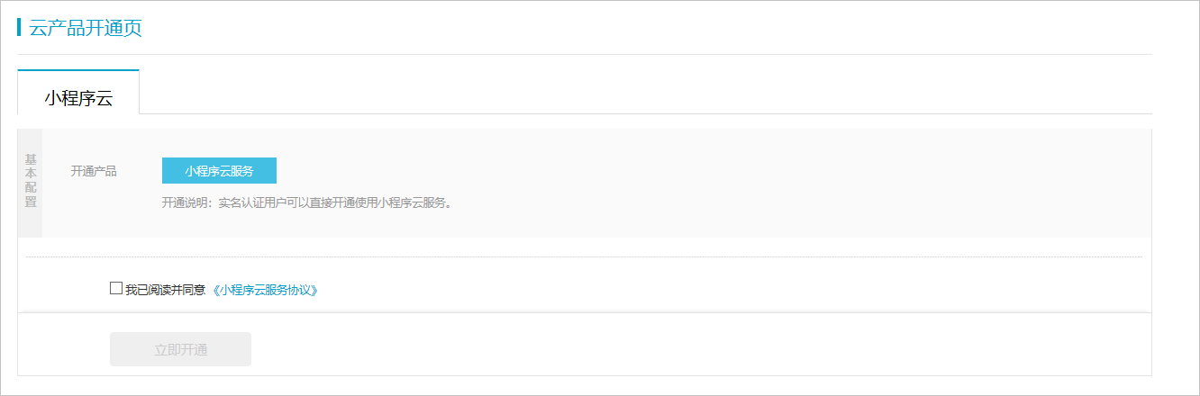 3.在阅读后,勾选【我已阅读并同意《小程序云服务协议》】复选框,然后单击【立即开通】。
