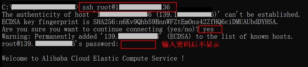 2.在终端中输入连接命令 ssh [username]@[ipaddress]。将其中的 username 和 ipaddress 替换为云产品资源提供的ECS服务器的 用户和 弹性IP。例如:ssh root@123.123.123.123