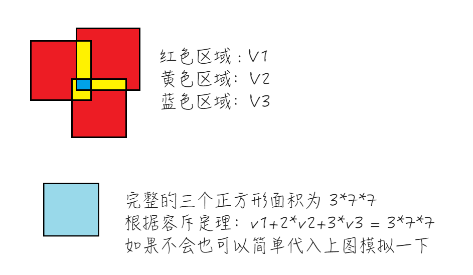 不与其他两个立方体有覆盖面积的地方为\(V_1\),两个立方体有覆盖的面积为 \(V_2\) ,三个立方体覆盖的面积为 \(V_3\)