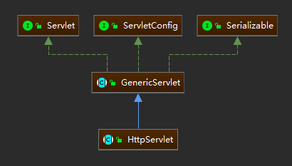 javax.servlet.Servlet最基本的Servlet接口,为简化其使用引入GenericServlet的Servlet实现类。因为servlet大多数运行在HTTP环境中,进而派生出一个javax.servlet.http.HttpServlet的子类更为有用。三者关系如下图: