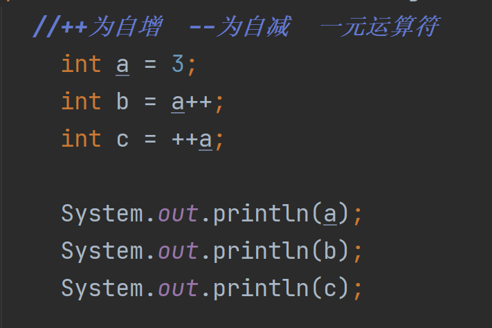 最后c=a, 也就是将刚刚b=a++这个没有显示出来的4这个数值再进行+1——也就是c=++a=已经加1的b(没有显示出来)优先进行加1,然后得出结果——也就是4+1=5