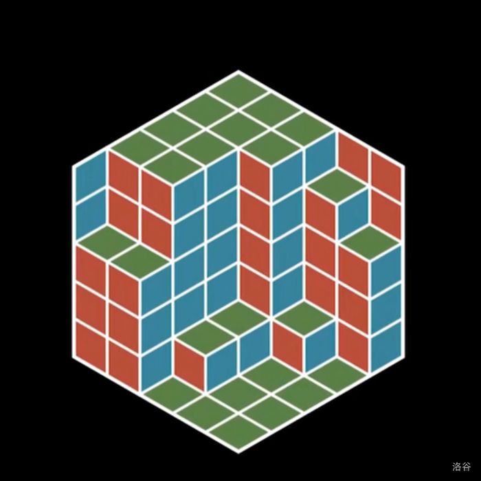 (这个和原题的三角形朝向不同),把匹配的三角形按横着和两种斜着匹配的方式分成三种,染上不同颜色,发现可以看成一个三维的情况的正方体堆叠问题。