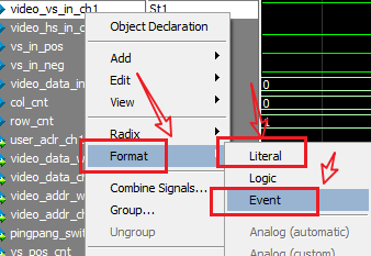 解决方法:在确认时钟信号没问题之后,可以将仿真中需要观测的时钟信号删除,或者在时钟信号名上右键,显示格式修改为Literal或者Event,如下图所示