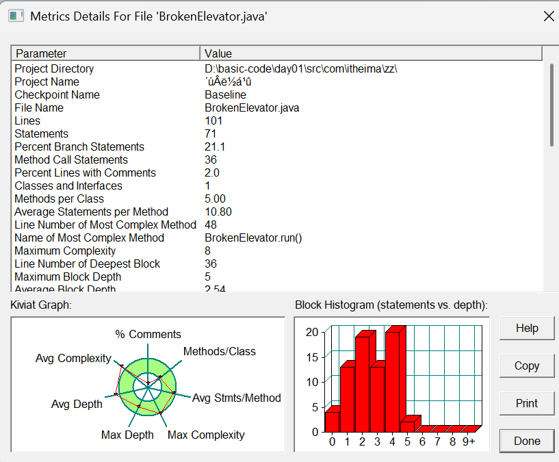 - 复杂度较高:最大复杂度为 8,最复杂方法是BrokenElevator.run(),这表明该方法内部可能有较多的逻辑分支,需要关注其可读性和可维护性。