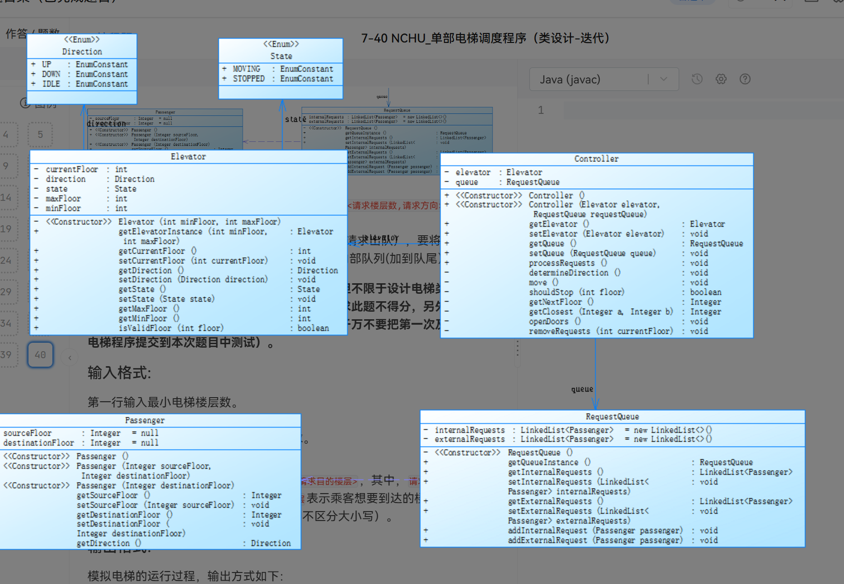 接着来到了第七次PTA题目集做到这个题目集前面两题的时候就已经感觉到问题的不对劲,已经感觉到这次电梯调度更会让人深陷其中。结果也是,,,不出所料确实,电梯调度又来到了一个新的高度,这次我的畏难心理更加明显了在做到第二题的时候就已经开始害怕了题目给出了类与类之间的关系但是我看着这些类里面各种复杂的方法名以及一些他们其中的调用关系等等,