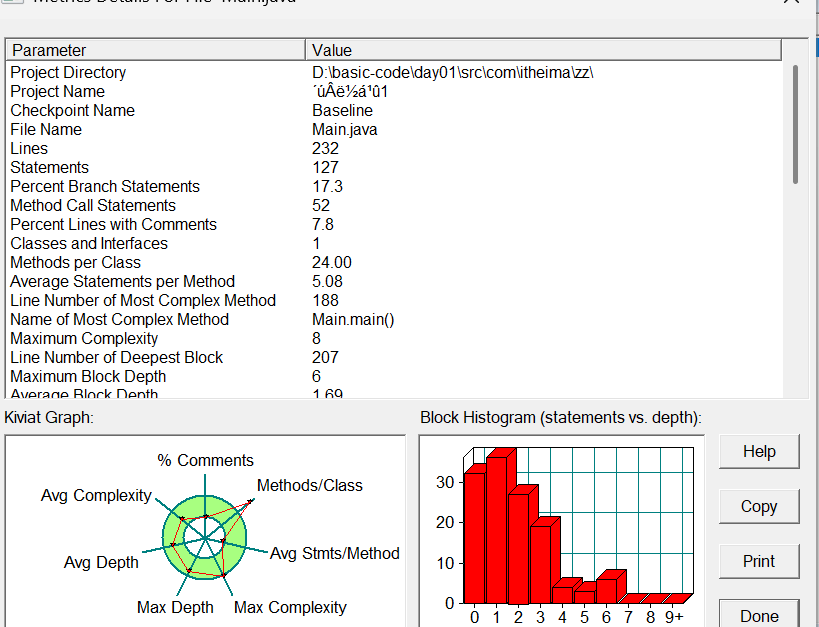 同样,界面下方有一个 Kiviat 图(Kiviat Graph)展示了平均复杂度(Avg Complexity)、方法数量 / 类(Methods/Class)、平均深度(Avg Depth)、平均语句 / 方法(Avg Stmts/Method)、最大深度(Max Depth)和最大复杂度(Max Complexity)等指标。