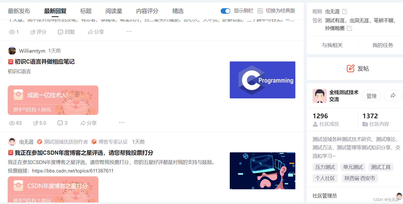 | 社区简介 | 测试领域各种测试技术研究,测试理论、测试方法、 测试管理等测试知识分享、交流和学习~ |