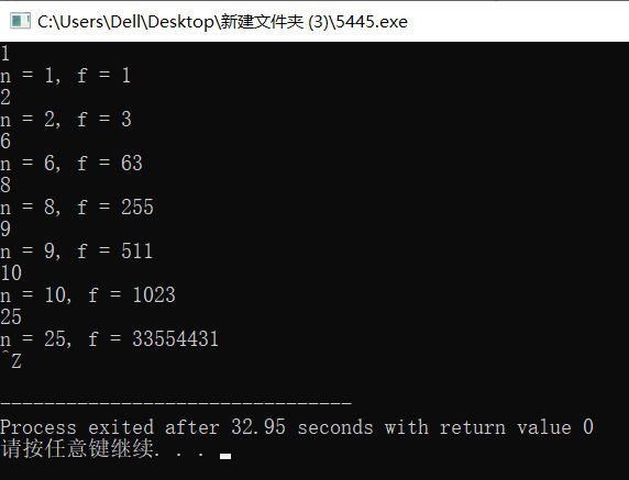 #include <stdio.h> long long fun(int n); // 函数声明 int main() { int n; long long f; while(scanf("%d", &n) != EOF) { f = fun(n)-1; // 函数调用 printf("n = %d, f = %lld\n", n, f); } return 0; } long long fun(int n){ long long f; if(n==1){ f=2; } if(n>1){ f=2*fun(n-1); } return f; }