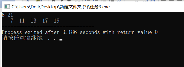 #include <stdio.h> #define N 1000 int fun(int n,int m,int bb[N]) { int i,j,k=0,flag; for(j=n;j<=m;j++) { flag=1; for(i=2;i<j;i++) if(j%i==0) { flag=0; break; } if(flag==1) bb[k++]=j; } return k; } int main(){ int n=0,m=0,i,k,bb[N]; scanf("%d",&n); scanf("%d",&m); for(i=0;i<m-n;i++) bb[i]=0; k=fun(n, m, bb); for(i=0;i<k;i++) printf("%4d",bb[i]); return 0; }