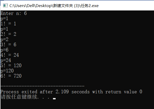 long long fac(int n); // 函数声明 int main() { int i,n; printf("Enter n: "); scanf("%d", &n); for(i=1; i<=n; ++i) printf("%d! = %lld\n", i, fac(i)); return 0; } // 函数定义 long long fac(int n) { static long long p = 1; printf("p=%lld\n",p); p = p*n; return p; }