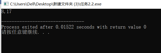 #include<stdio.h> int func(int, int); int main() { int k=4,m=1,p1,p2; p1 = func(k,m) ; p2 = func(k,m) ; printf("%d,%d\n",p1,p2) ; return 0; } int func(int a,int b) { static int m=0,i=2; i += m+1; m = i+a+b; return (m); }