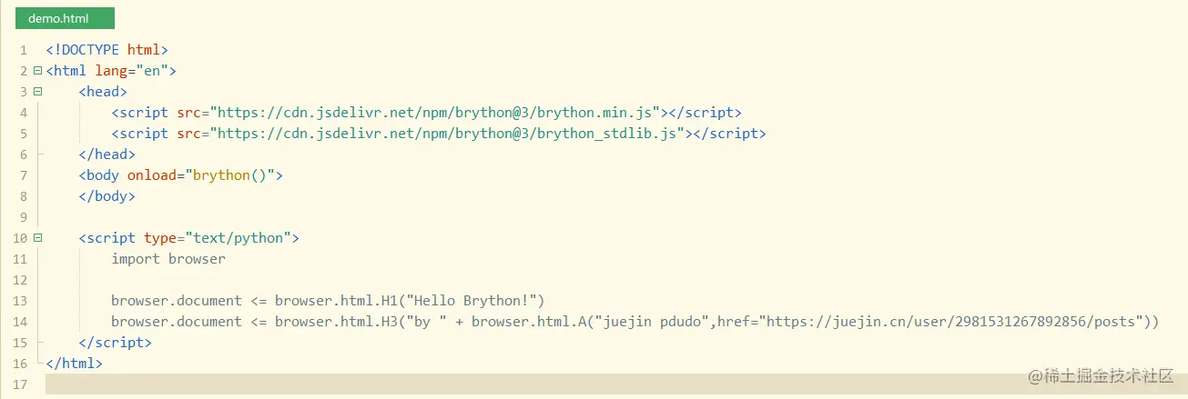 如上代码的意思是,向页面插入h1标签,内容为: "Hello Brython!" , 而后再插入h3标签,内容为:"by juejin pdudo",再次基础上"juejin pdudo",我们建立一个a标签,指向我的掘金地址。