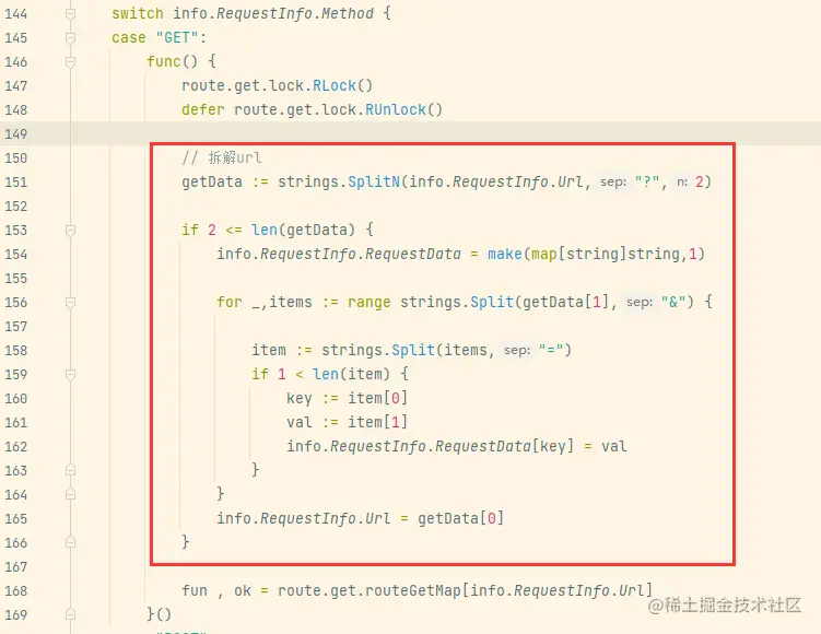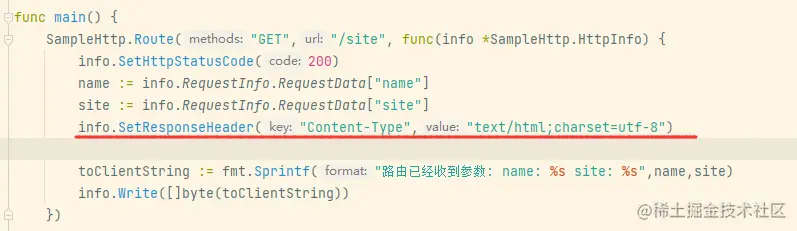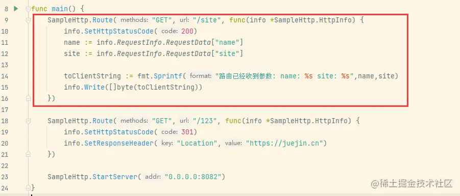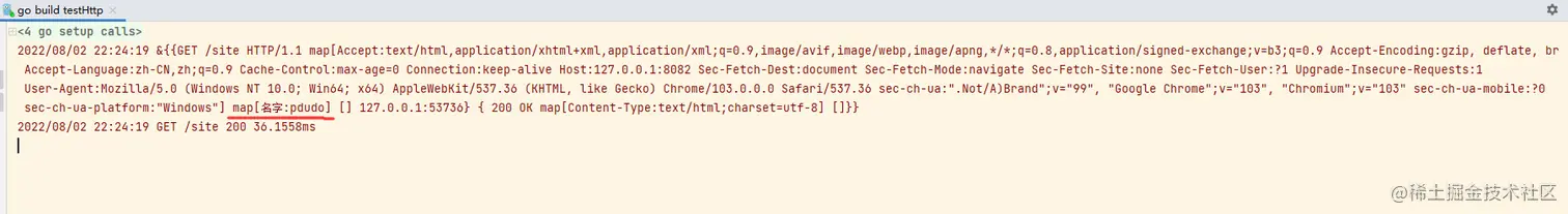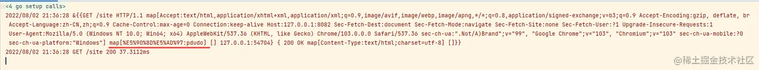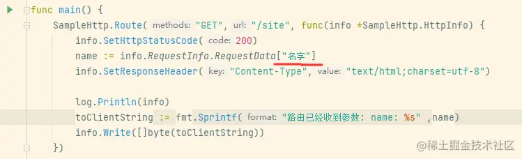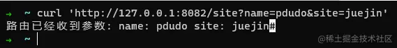 这样的话,就将参数写到了我们定义的map中,我们在路由函数中,直接进行获取map的数据即可,例如,我的URL``http://127.0.0.1:8082/site?name=pdudo&site=juejin格式是这样的,我想获取name和site的值,我门在定义路由函数中,就可以这样写: