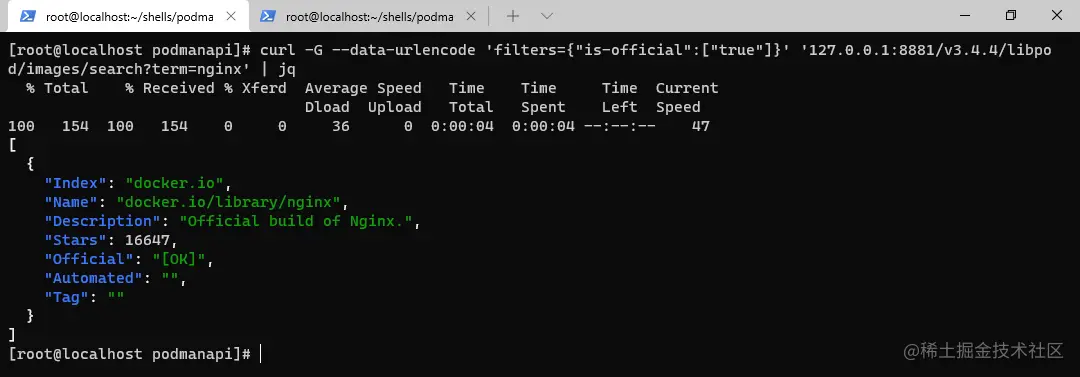 命令: curl -G --data-urlencode 'filters={"is-official":["true"]}' '127.0.0.1:8881/v3.4.4/libpod/images/search?term=nginx' | jq