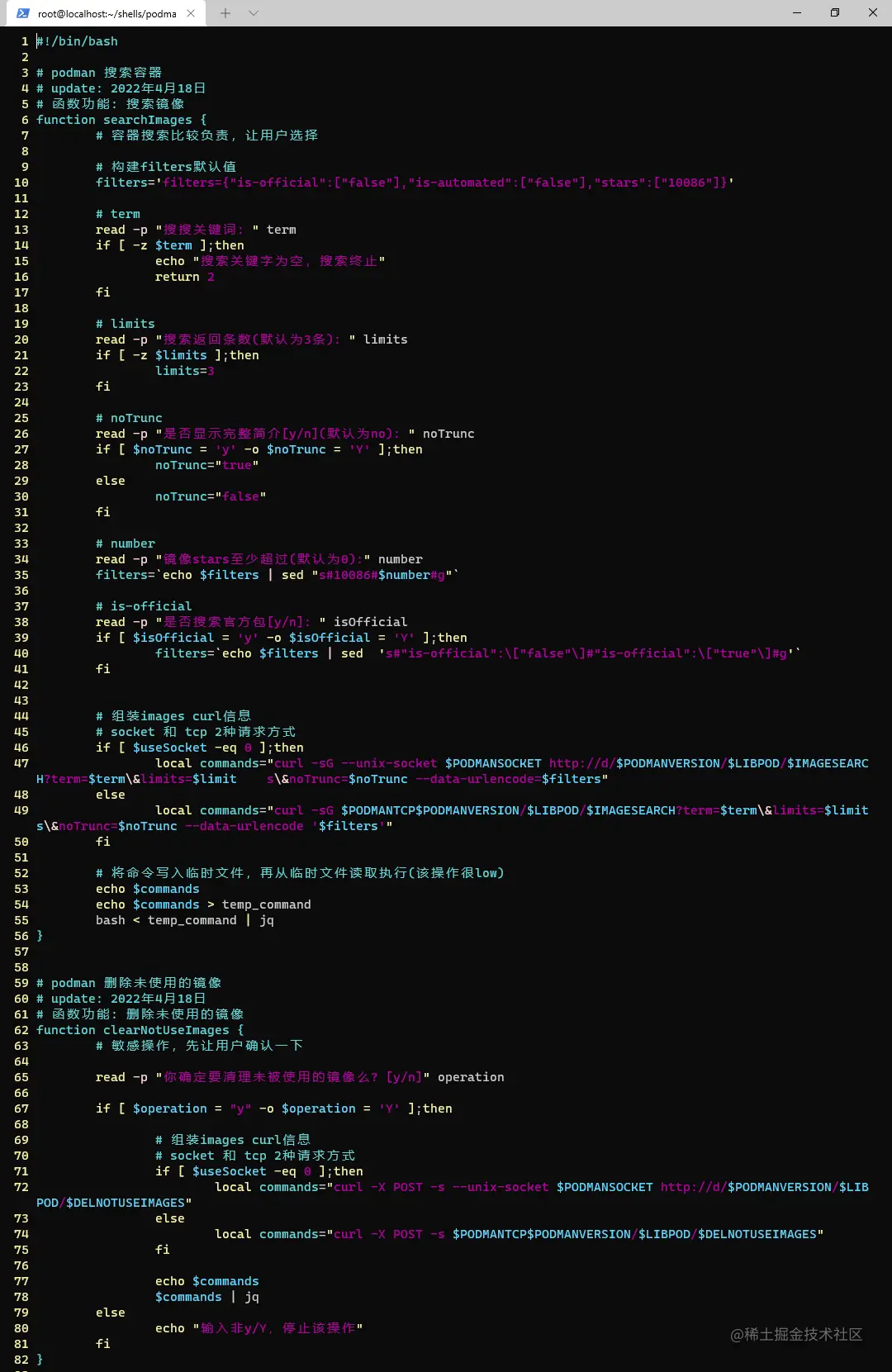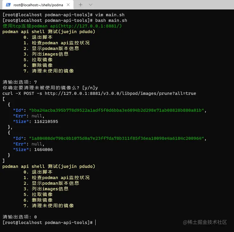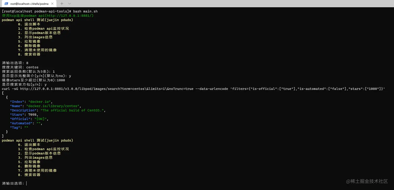 我们一般使用的images的操作为 搜索镜像、拉取镜像、查看镜像、清理未建立容器的镜像 以及 删除镜像 ,好的,我们完善下podman api shell小脚本