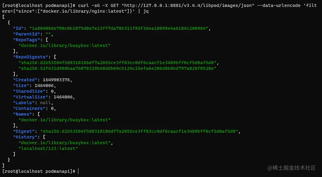 命令: curl -sG -X GET "http://127.0.0.1:8881/v3.4.4/libpod/images/json" --data-urlencode 'filters={"since":["docker.io/library/nginx:latest"]}' | jq