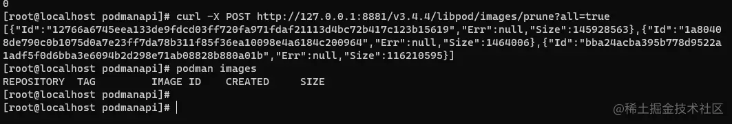 命令: curl -X POST http://127.0.0.1:8881/v3.4.4/libpod/images/prune?all=true