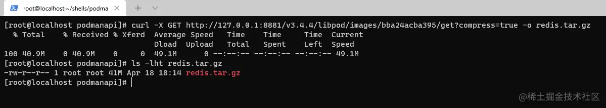 命令: curl -X GET http://127.0.0.1:8881/v3.4.4/libpod/images/bba24acba395/get?compress=true -o redis.tar.gz