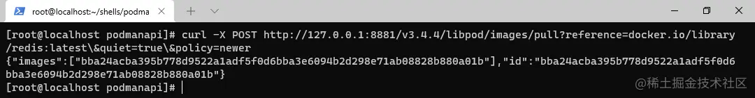 命令: curl -X POST http://127.0.0.1:8881/v3.4.4/libpod/images/pull?reference=docker.io/library/redis:latest&quiet=true&policy=newer