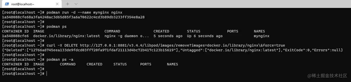 删除命令: curl -X DELETE http://127.0.0.1:8881/v3.4.4/libpod/images/remove?images=docker.io/library/nginx&force=true