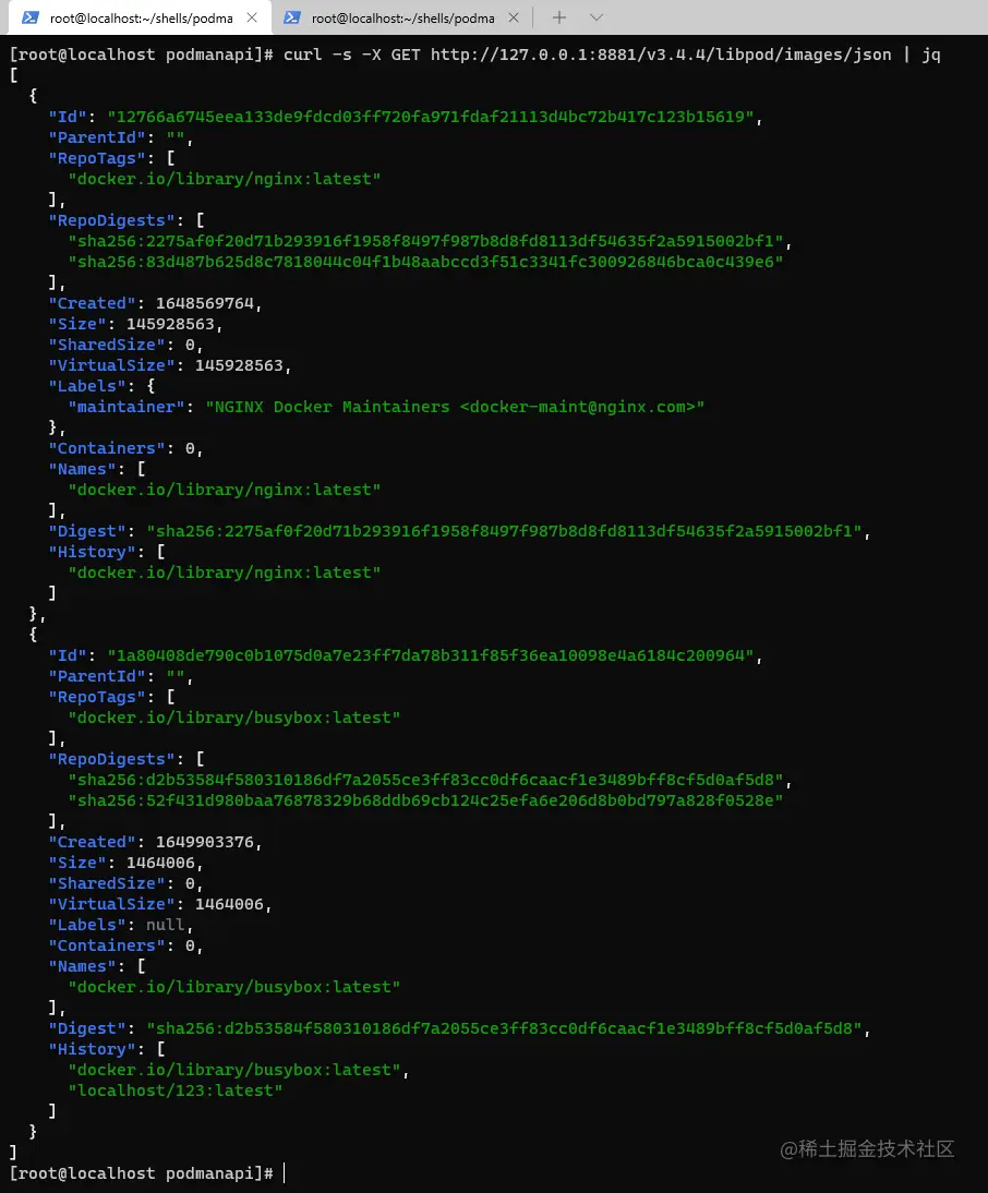 命令: curl -s -X GET http://127.0.0.1:8881/v3.4.4/libpod/images/json | jq