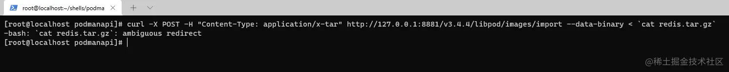 podman import导入的时候,没有问题,在使用podman api导入镜像的时候出问题了,该问题应该是curl的问题,我找了一下,都没找到好的解决方案
