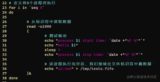 这个多进程语句和之前语句类似,唯一的不同是,多了一个往管道取值的动作还有复写管道的动作,以此来实现进程个数控制。