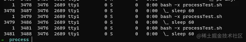 我们sleep时间调整的长一些,我们可以看看具体进程树