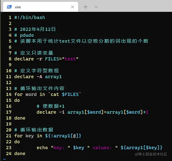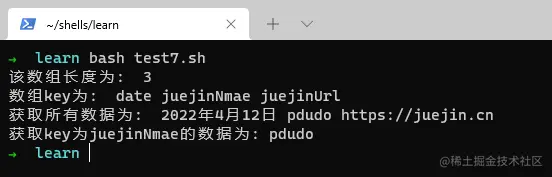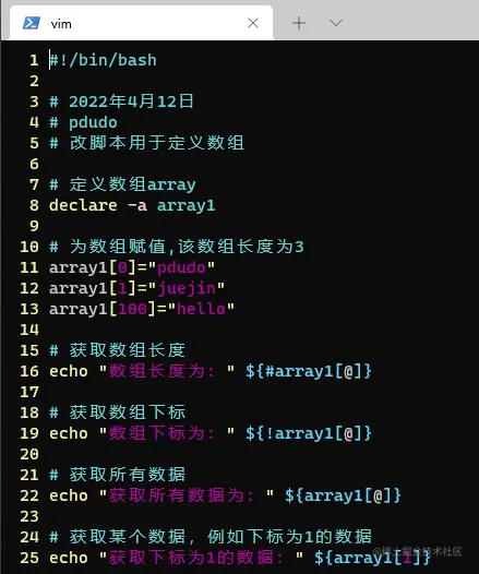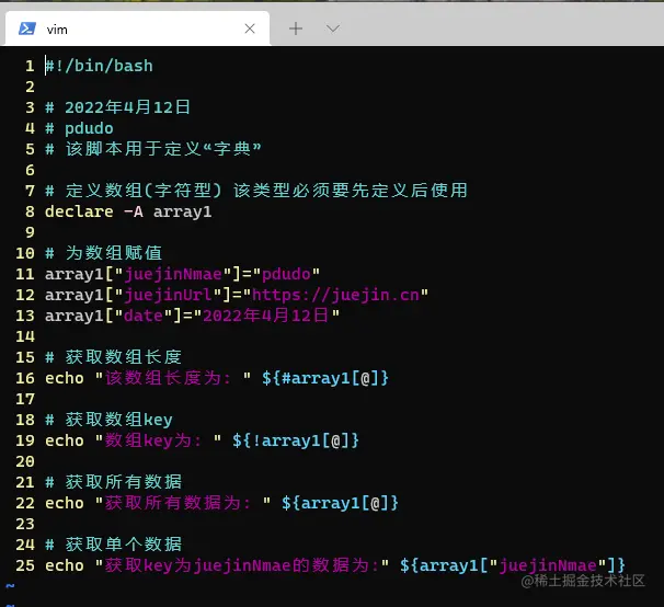 我们一般使用declare -A来定义数组(字符串式),这个在bash中,也称为数组,不过它更像字典了,该类型必须要先申明再使用,我们按照上面的例子写一个