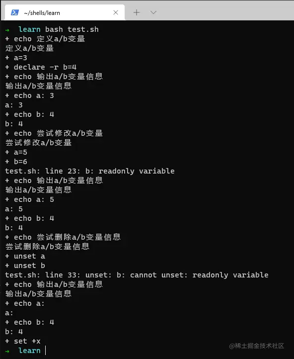 我们在编写shell过程中,可以使用readonly/declare -r来定义只读变量类型,在定义后,我们不能进行修改和删除