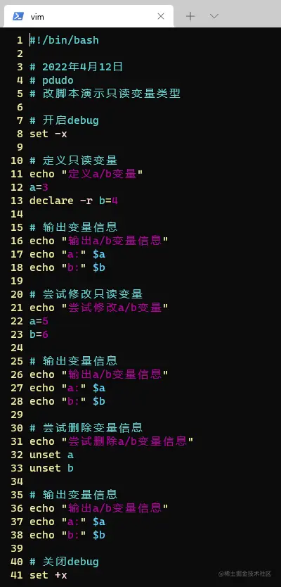 那对于只读变量,我们什么时候需要呢? 我们定义后不会修改的变量,可以使用只读变量来代替,例如: 脚本中的数据库账号和密码等